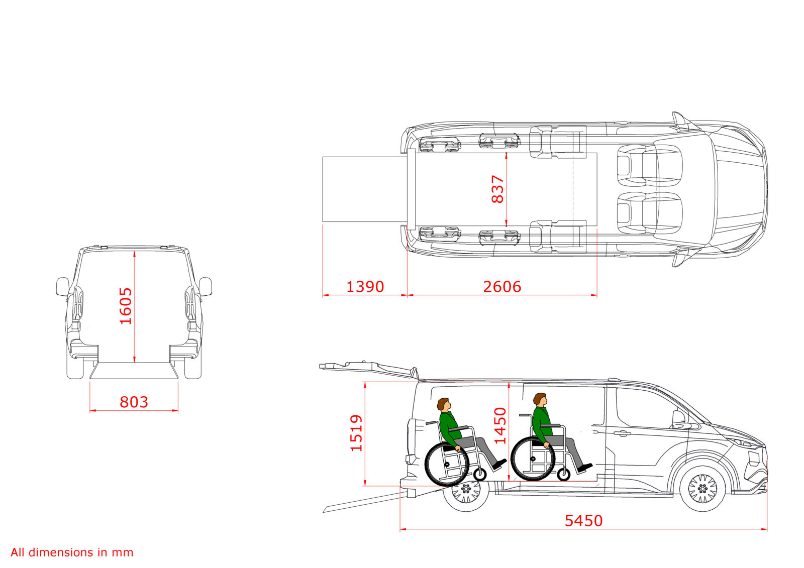 The Ford Tourneo Custom & Transit Custom Kombi are practical family cars offering flexible seating and ample space. Our conversion offers optimal comfort and visibility for up to 2 wheelchair passengers. This conversion is possible in the L2H1 version of the Ford Tourneo Custom & Transit Custom Kombi.